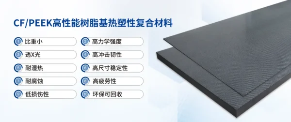 CF/PEEK热塑性碳纤维复合材料一般是以缎纹编织的为主,缎纹的纹路之间间隙大,有错层间隙更有利于PEEK胶料的浸渍或者浸润。PEEK材料的流动性不好,冷却固化速度快。所以碳纤维复合材料的浸润难度要远远高于环氧型碳纤维复合材料。PEEK型的碳纤维复合材料相较于普通环氧型的碳纤维复合材料,性能更加优越,解决了环氧型复合材料存在的很多问题。目前主要广泛应用于医疗和军工行业。