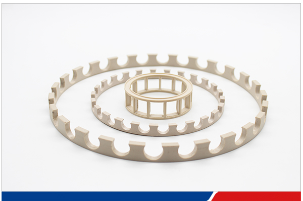 PEEK轴承保持架的突出的特点就是强度和弹性的结合。 PEEK材料能够在与滚珠接触后表现出良好的滑动性能,而PEEK轴承保持架的与滚动元件接触的表面则具有出色的光滑度,二者运动时产生极低的摩擦力,从而导致轴承的发热和磨损都保持在低水平。