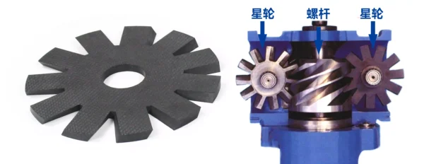 如果选用钢制的星轮,由于钢材膨胀系数大,膨胀量大,所以必须在星轮与螺杆间留较大的间隙,不但泄露多,效果低,而且容易咬死造成重大故障。如果选用一般复合材料的星轮,在运转过程中的剪切力和机械磨擦的作用下,不仅很快就会损坏,造成内部泄漏增大,效率下降,而且维修频繁,增大维护人员劳动强度和维修成本。