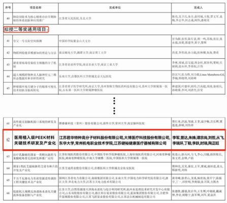 2024年8月14日,江苏省科学技术厅公布了《2023年度江苏省科学技术奖综合评审结果公示》,由君华股份汇同大博医疗科技股份有限公司、东华大学、常州机电职业技术学院、江苏健裕健康医疗器械有限公司申请的江苏省科学技术奖项目—“医用植入级PEEK材料关键技术研发及产业化”喜获二等奖。