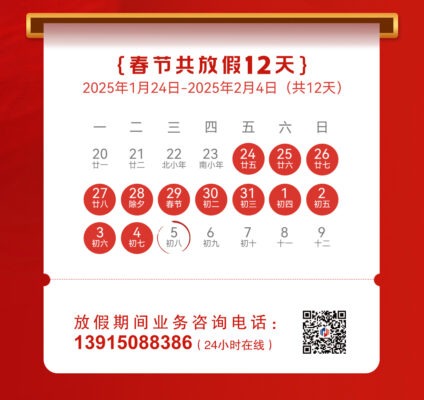君华股份2025年春假放假通知 分类: 企业新闻, 新闻资讯 日期: 2025-01-23 阅读量: 655 尊敬的新老客户及全体员工: 衷心感谢大家在过去一年里对我司的支持与厚爱!君华股份祝大家新春快乐、万事大吉! 2025年春节放假时间安排如下: 2025年1月24日至2025年2月4日,共放假12天。 2025年2月5日(正月初八)正常上班。 因我司放假给各位带来的不便敬请谅解,放假期间如有需要请拨打13915088386,我司销售经理24小时为您提供下单服务和咨询。 标签: