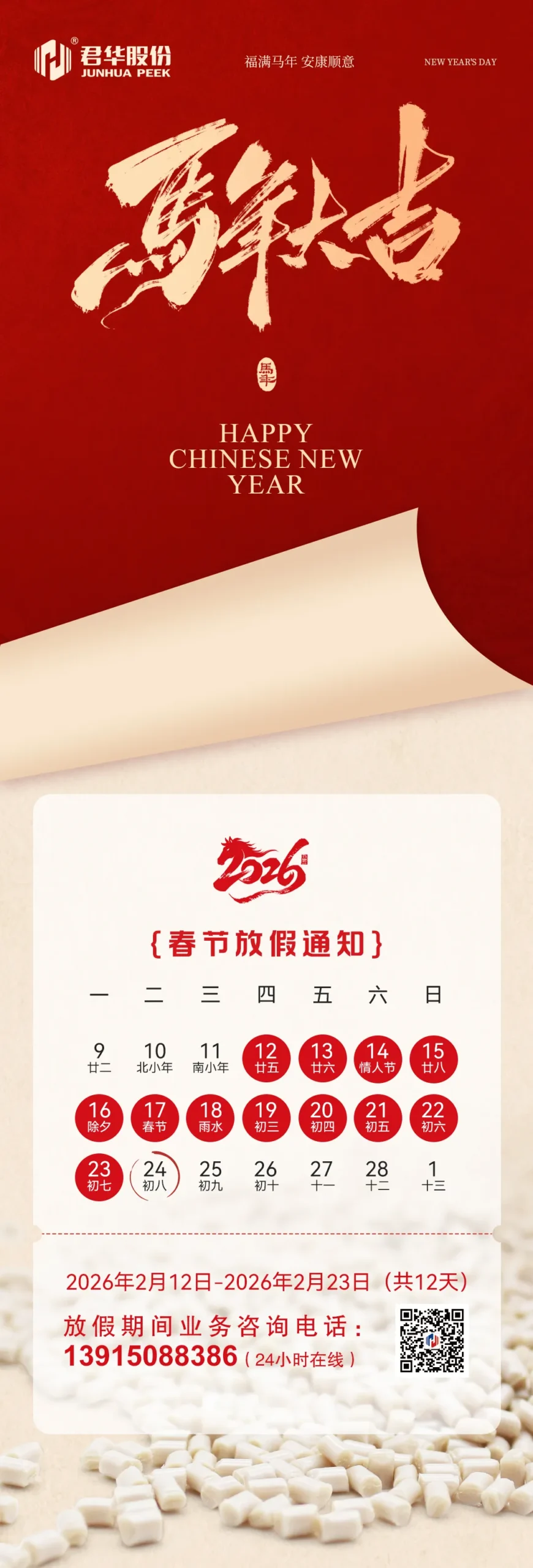 在此,君华股份向您及家人致以最诚挚的新春问候:衷心祝愿大家新春快乐、万事顺意、阖家安康喜乐!为了及时响应您的应急需求,放假期间我们的服务保障持续在线,如有任何业务咨询,请随时拨打24小时服务热线:13915088386,我们将竭诚为您守候。
