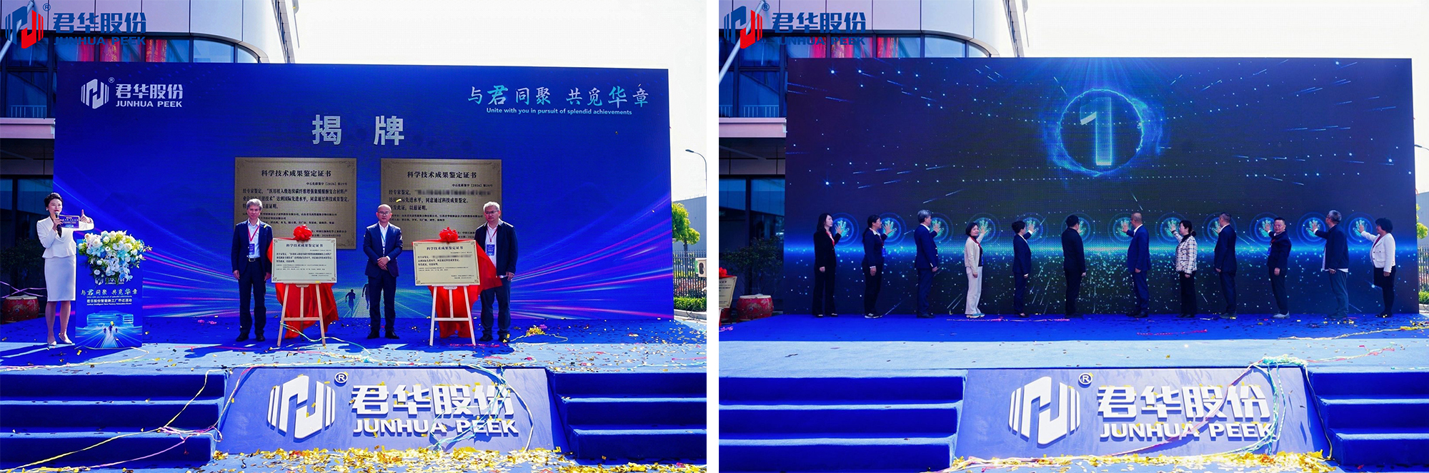 创新驱动发展,科技铸就未来。由君华股份、山东君昊高性能聚合物有限公司、常州君华医疗科技有限公司共同完成的“医用植入级连续碳纤维增强聚醚醚酮复合材料产业化制备关键技术”顺利通过中国石油和化学工业联合会权威鉴定,经行业专家严格评审,技术均达到“国际先进水平”。君华股份今天为这项达到国际先进水平的科技成果正式揭牌。