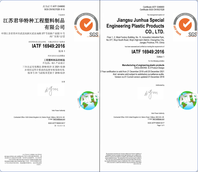 为更好的进军汽车PEEK产品领域,江苏君华从战略的眼光出发,于2018年1月开展导入IATF16949:2016质量管理体系,经过了贯标、文件编制、发布、内审、管审等过程,通过半年来的运行,质量管理体系不断推进完善。