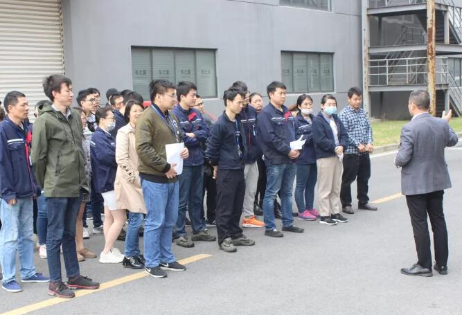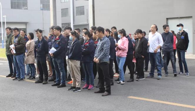 12:15厂区警报声响起,在车间主管和办公室组织人员的协调下,各位同事弯腰,掩鼻,小步快跑逃离厂区。按照疏散指示图红色指示方向到达公司大门口集合,集合后各组清点人数报告失踪人员并组织搜救行动,并且口头演习119报警词。
