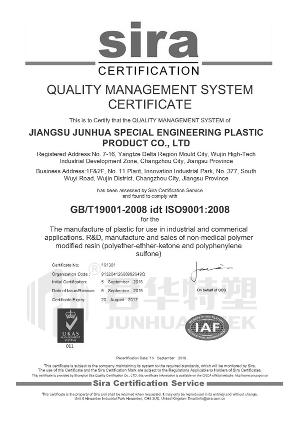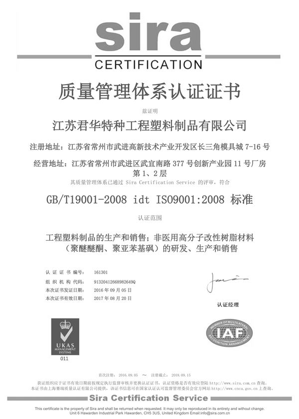 首页 > 企业新闻2016年9月5日,经过一系列严格的外审考核,江苏君华特塑成功获得ISO9001质量管理体系认证。这一喜讯证明江苏君华特种工程塑料制品有限公司已经成功建立了ISO9001:2008的质量管理体系。