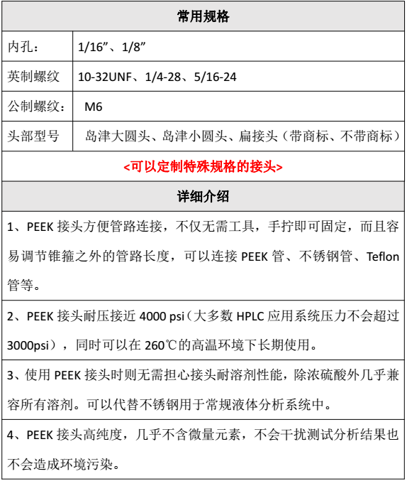 1、PEEK接头方便管路连接,不仅无需工具,手拧即可固定,而且容易调节锥箍之外的管路长度,可以连接PEEK管、不锈钢管、Teflon管等。