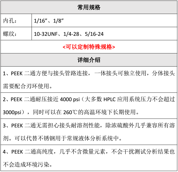 1、PEEK二通方便与接头管路连接, 一体接头可独立使用,分体接头需要配合刃环使用。
