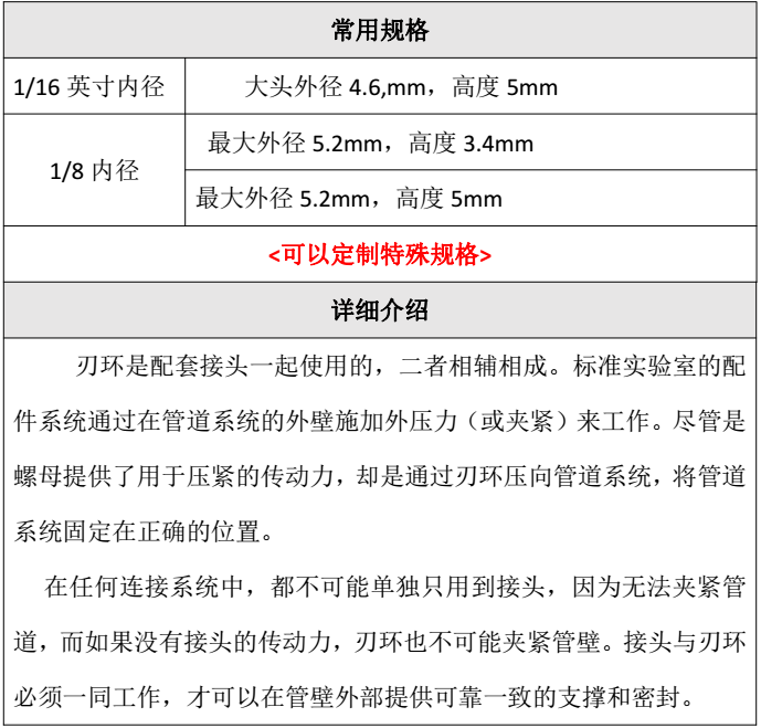 刃环是配套接头一起使用的,二者相辅相成。标准实验室的配件系统通过在管道系统的外壁施加外压力(或夹紧)来工作。尽管是螺母提供了用于压紧的传动力,却是通过刃环压向管道系统,将管道系统固定在正确的位置。