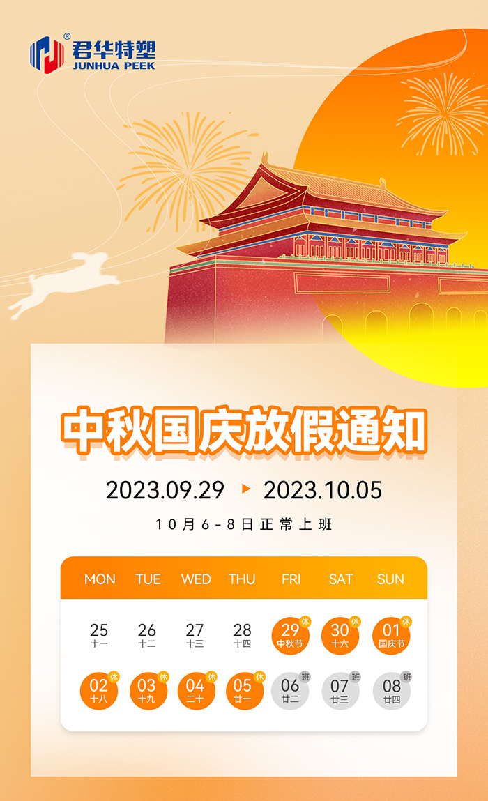 中秋·国庆节到来之际,结合公司当前实际生产订单情况,江苏君华特塑经研究决定,放假时间安排如下:
