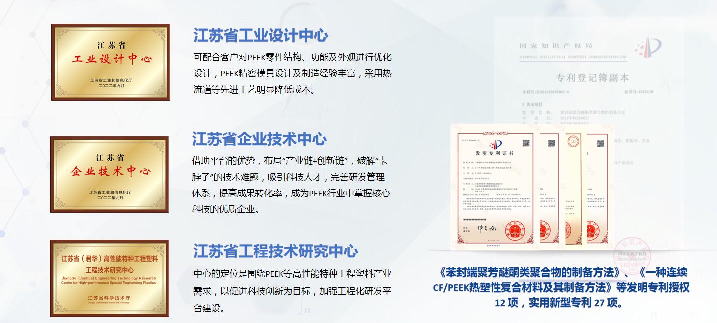 2022年,已建立了三大省级研发平台:江苏省工业设计/江苏省企业设计/江苏省工程技术研究中心,公司现专有技术有12项发明,实用新型27项:一种PEEK片材连续挤出的生产设备;一种聚醚醚酮细管挤出生产工艺及装置;一种转子及其制备方法等。同时,与国内吉林大学、南京化工大学长期保持技术交流及合作。