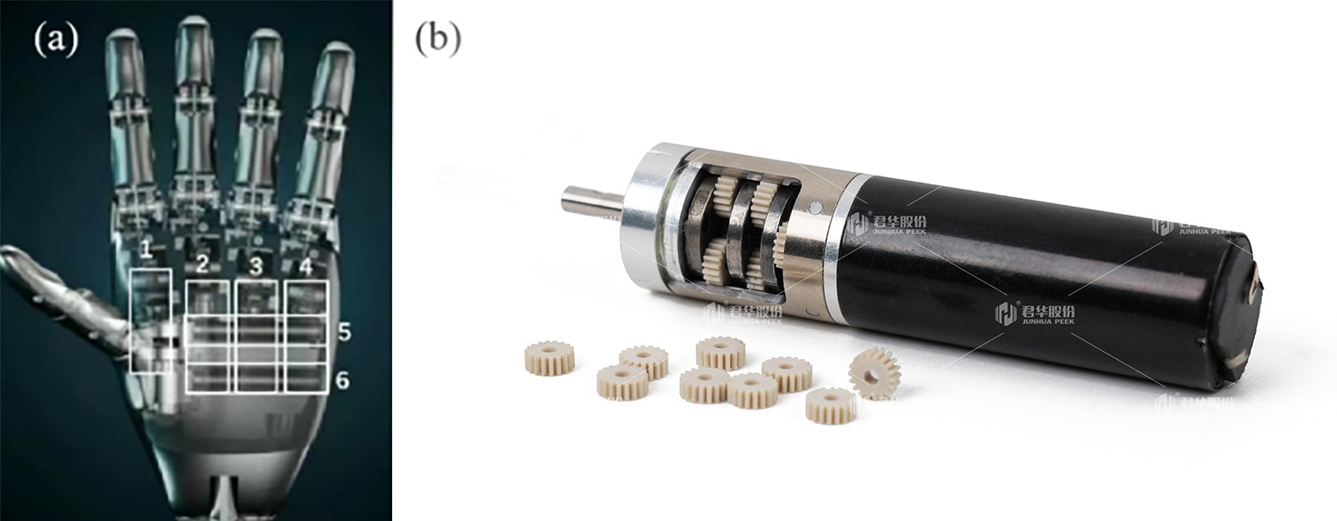 空心杯电机配合PEEK齿轮,兼具高转速、低惯量、高响应速度优势,能精准匹配灵巧手“快速、精细”的运动需求。