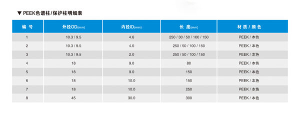 > 各种规格的PEEK色谱柱(不含内部填充物)。