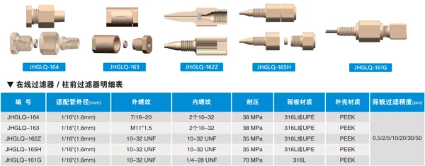 > 具有生物兼容性柱前过滤器,过滤片采用超高分子聚乙烯或者烧结不锈钢材质,其他部件全部采用耐腐蚀的PEEK材质。