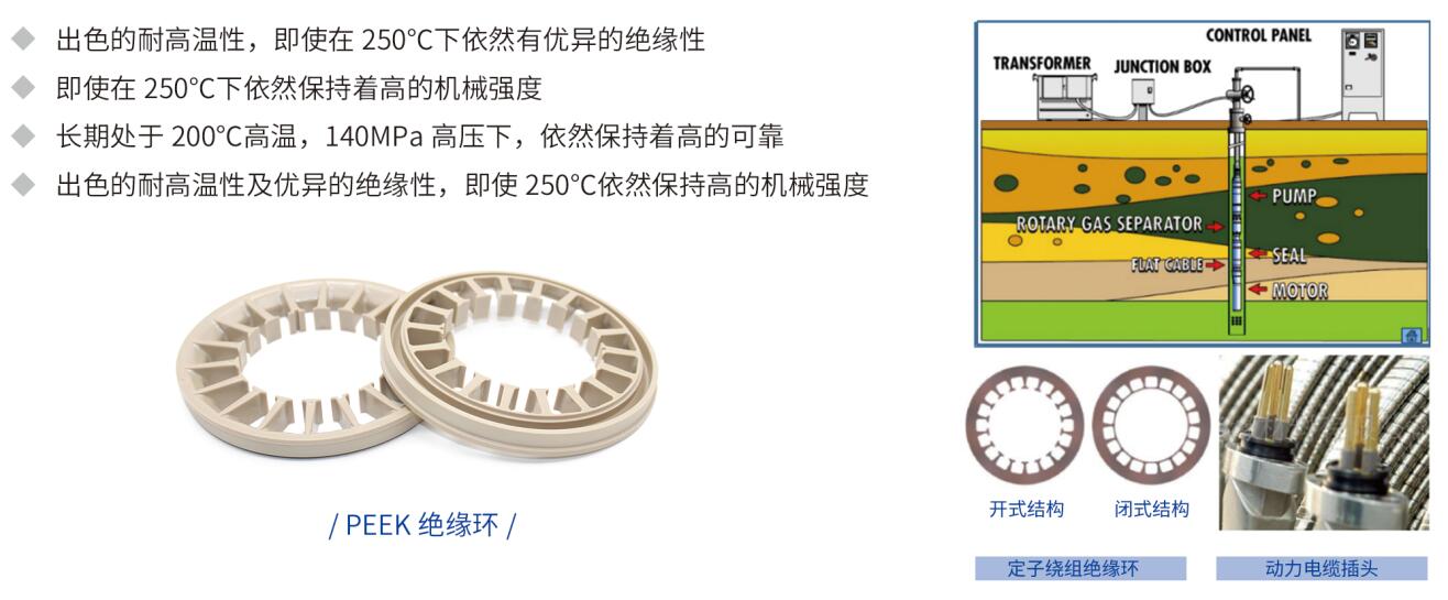 采用PEEK及其改性复合材料加工成的高温耐磨轴套、绝缘圈、前后堵等高性能塑料零件,可以替代铜合金、不锈钢、聚四氟乙烯、普通工程塑料、石墨等传统材料,满足石油测井及开采设备中对零件耐磨损、耐高温、高强度、无油润滑、酸碱腐蚀、高可靠性等苛刻技术要求,可以降低运行成本并有助于设备在高产能下,连续稳定的生产。